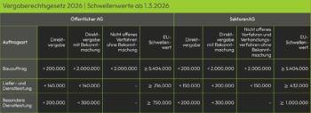 Vergaberechtsgesetz 2026 | Neue Schwellenwerte ab 1.3.2026 vonRalf Blaha am27.02.2026VergaberechtAb 1.3.2026 gelten gemäß dem Vergaberechtsgesetz 2026 die folgenden Schwellenwerte: Betrugsversuche mit Informationen aus TED-Veröffentlichungen Zur Übersicht Bereits auf neuestem Beitrag